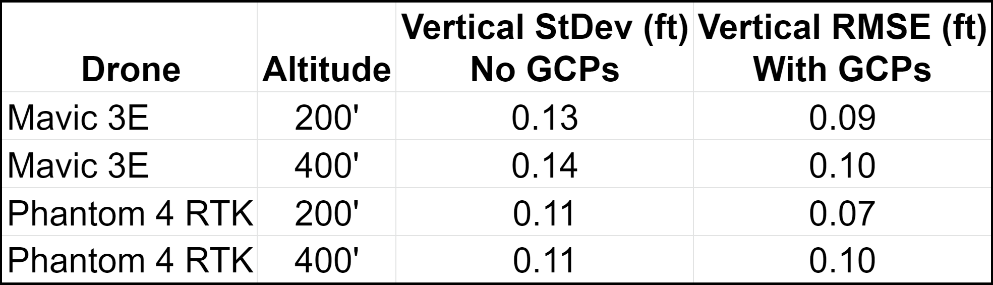 That said, it is interesting to note that the Phantom 4 RTK had a better standard deviation of error when no ground control points were used at all. This could indicate that the Mavic 3 Enterprise’s camera is slightly more susceptible to small variations in camera calibration than the Phantom 4 RTK. However, as the maximum difference in results between the two systems is only 0.03’, it is entirely possible that this is due purely to statistical noise, and not any meaningful difference between the two systems.