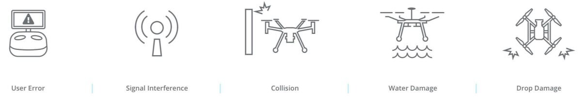 Replacement units are provided for: Crash & Collision Damage, Signal Interference, and other accidents caused by User Error. DJI will replace your aircraft even if its water damaged.