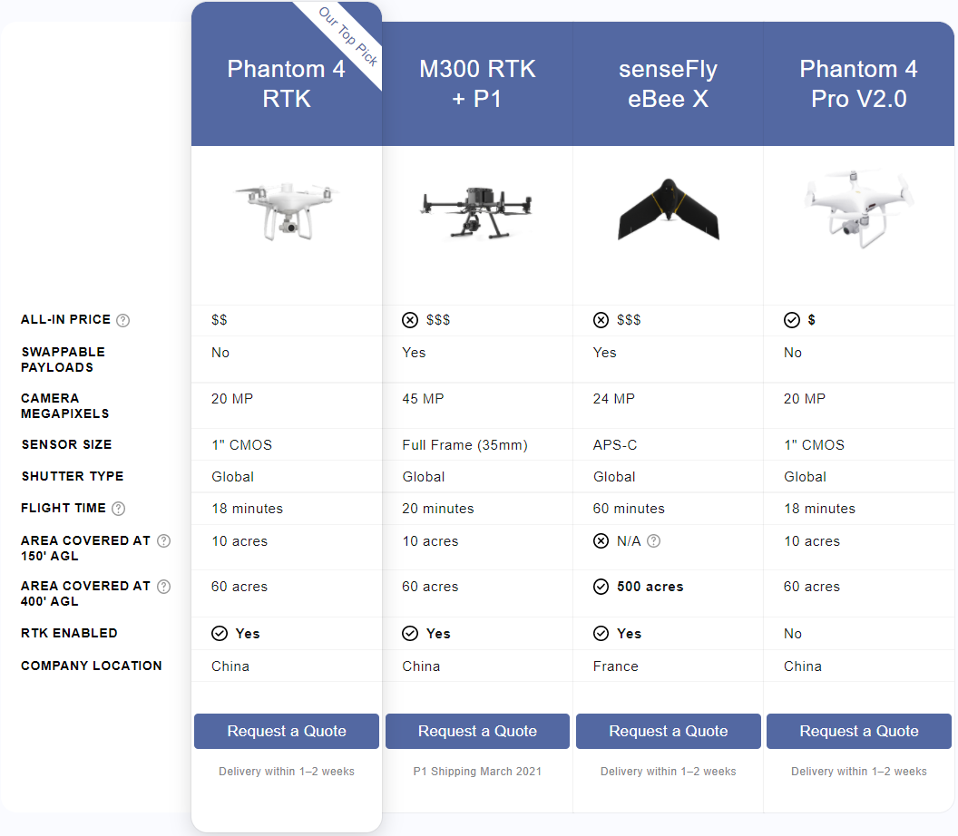 If the stated goal is to produce a topographic or planimetric survey, then these are the drones that Aerotas recommends. Aerotas does not base our recommendations solely on which drone has the best specs. Before making a recommendation, we consider several factors: reliability, usability in the field, data quality, the complexity of processing the data, and value (how quickly can you see a return on investment).